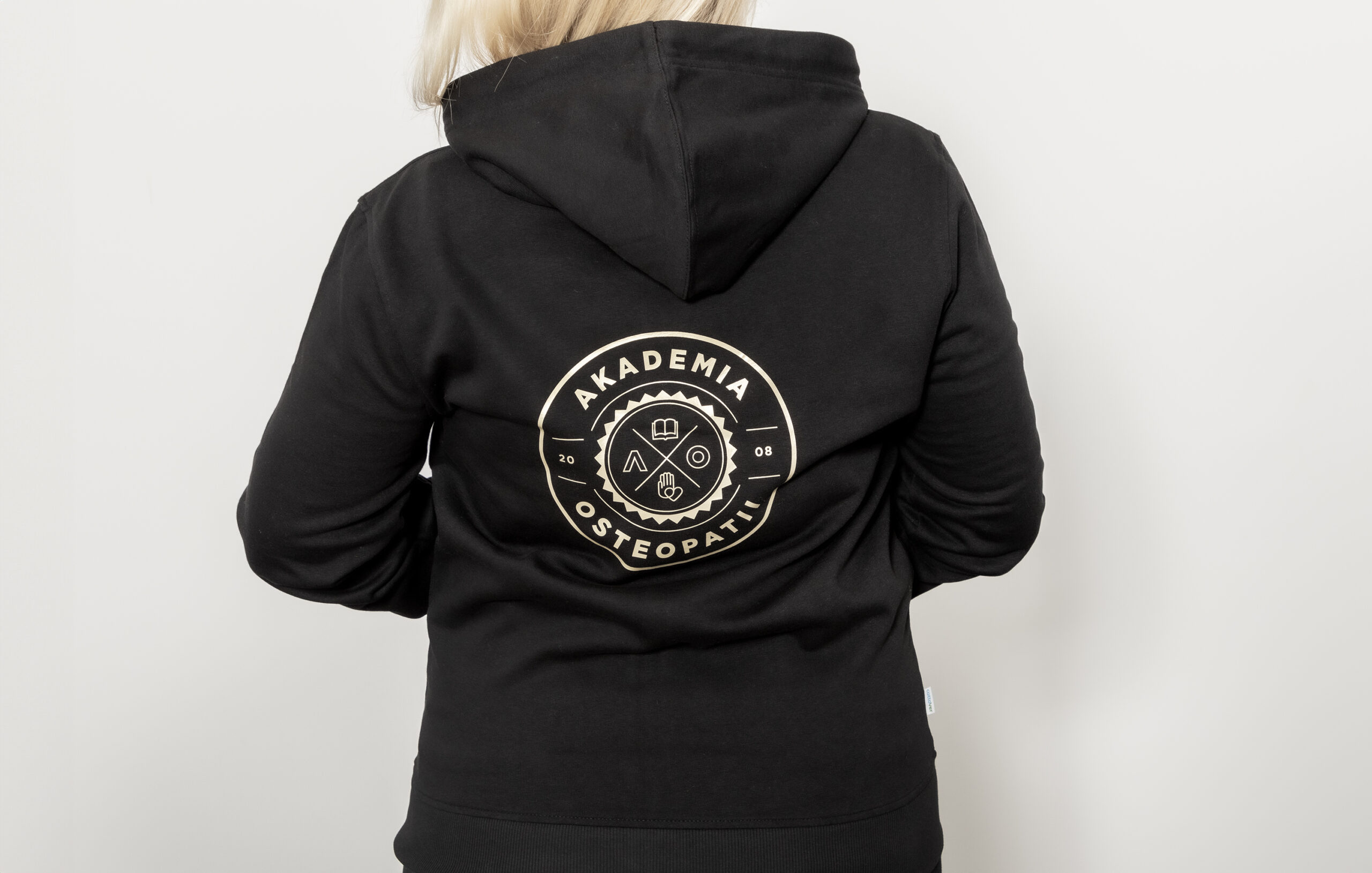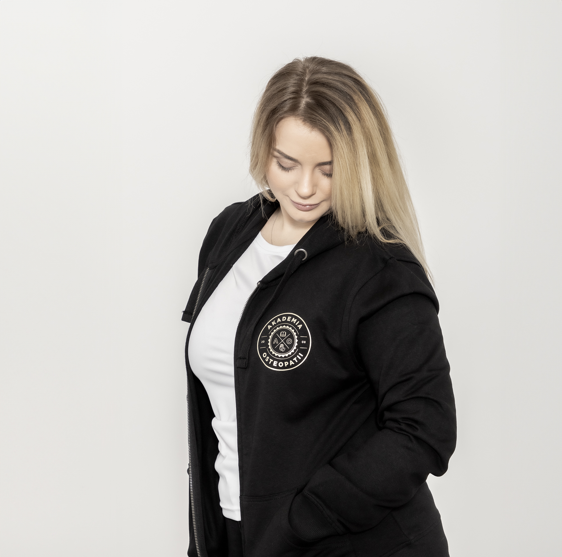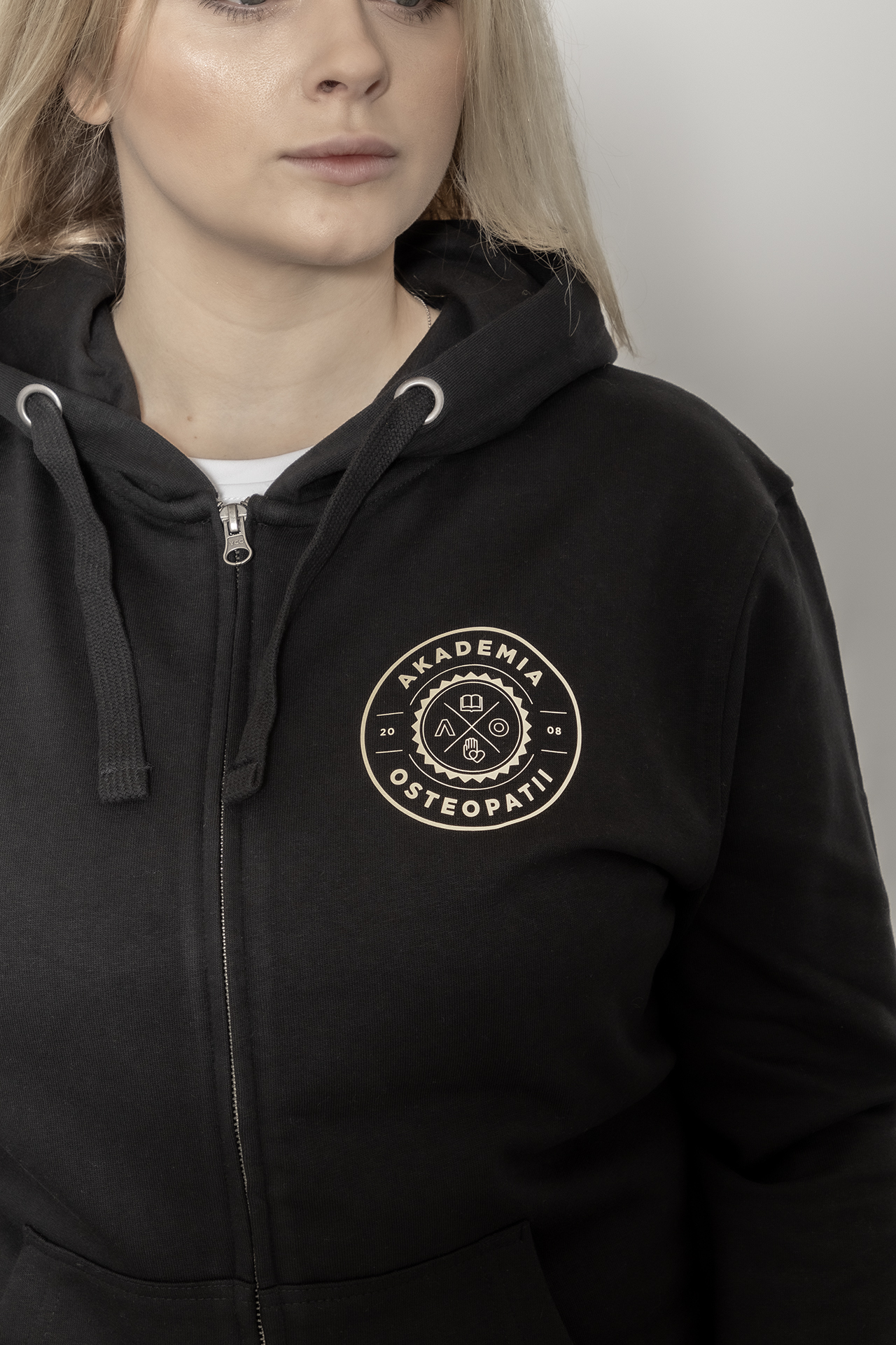 Dopasowana, damska rozpinana bluza z kapturem. Na piersi oraz na plecach posiada nadruk z logo Akademii Osteopatii. Dodatkowo ma dwie kieszenie z przodu oraz ściągacze. Wykonana z wysokiej jakości materiałów: